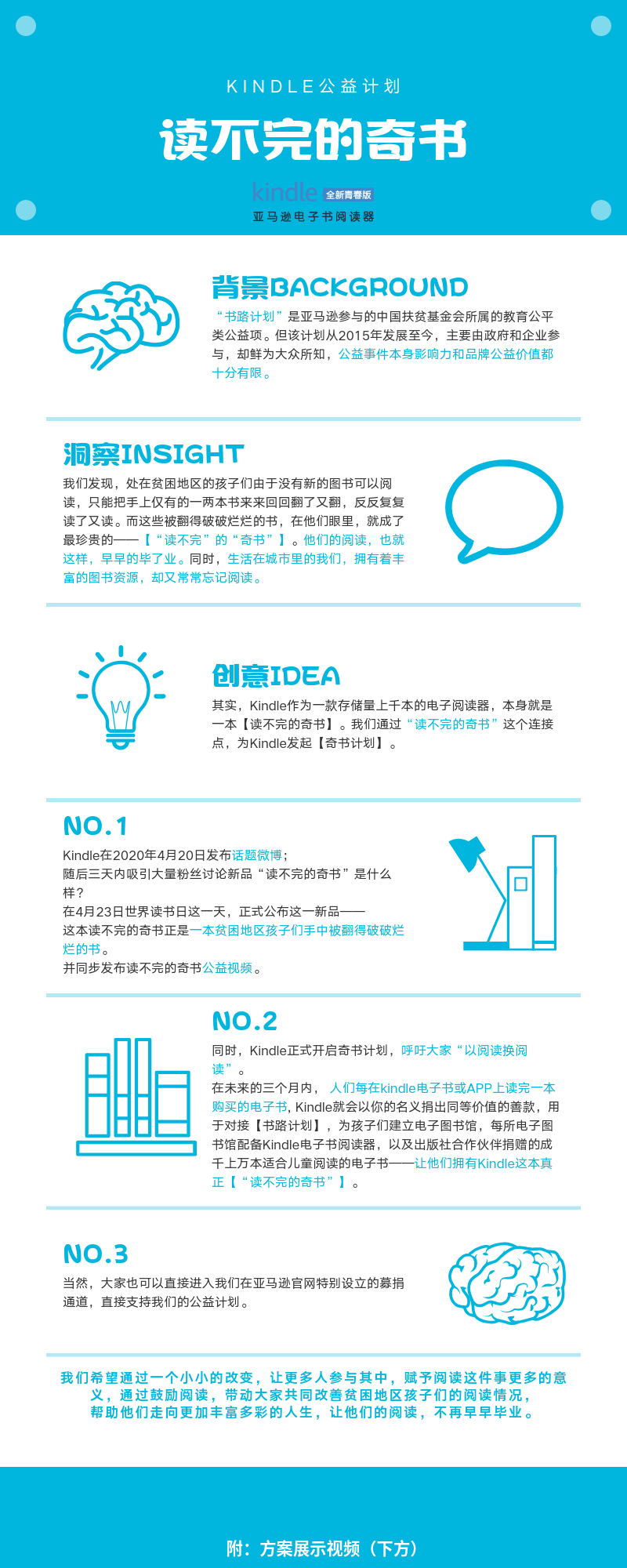 【洞察】处在贫困地区的孩子们由于没有新的图书可以阅读,只能把手上仅有的一两本书来来回回翻了又翻,反反复复读了又读。而这些被翻得破破烂烂的书,在他们眼里,就成了最珍贵的——【“读不完”的“奇书”】。他们的阅读,也就这样,早早的毕了业。 其实,Kindle作为一款存储量上千本的电子阅读器,本身就是一本【读不完的奇书】。 【创意】我们通过“读不完的奇书”这个连接点,为Kindle发起【奇书计划】,呼吁大家“以阅读换阅读”。 在未来的三个月内, 人们每在kindle电子书或APP上读完一本购买的电子书。Kindle就会以你的名义捐出同等价值的善款,用于对接【书路计划】,为孩子们建立电子图书馆,每所电子图书馆配备Kindle电子书阅读器,以及出版社合作伙伴捐赠的成千上万本适合儿童阅读的电子书——让他们拥有Kindle这本真正【“读不完的奇书”】。
