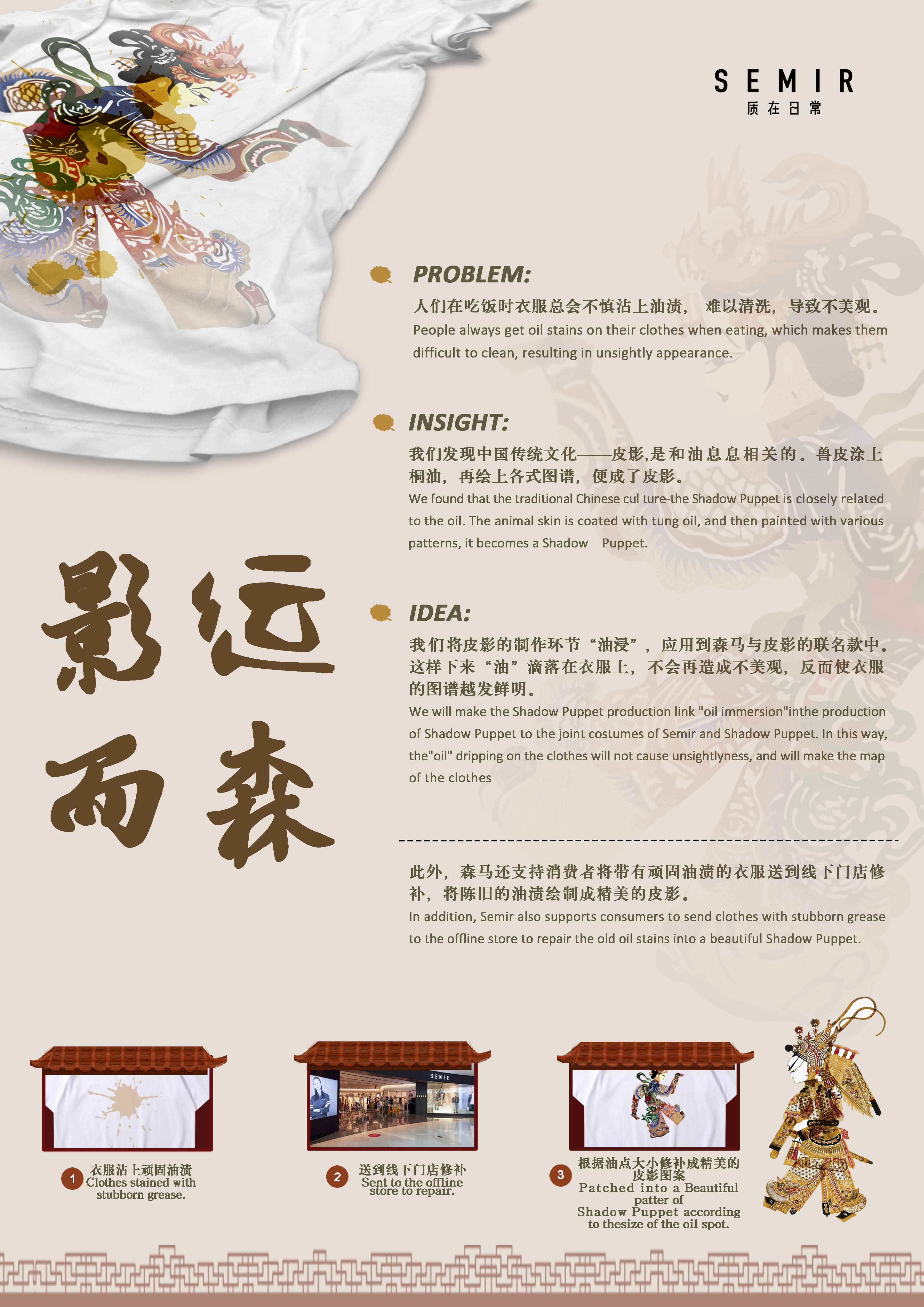 《影运而森》 1 242 0 分享 为避免“衣服滴油千古恨,为何不把围裙带”的问题,森马X中国非遗文化——皮影联名款《影运而森》,利用皮影的制作过程“油浸”解决衣服上滴油问题 赞一下 敦煌壁衣 ‹ › 发布